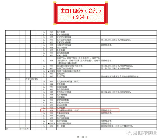 湖北夢陽藥業股份有限公司生產的生白口服液(合劑)(954)、豬苓多糖膠囊(150)、一清顆粒(85)、銀黃膠囊(128)、胃康靈膠囊(635)均被納入新版醫保目錄,其中“生白顆粒、生白口服液(合劑)”醫保支付限制調整。