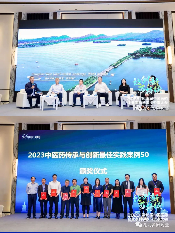 由中國醫(yī)藥企業(yè)管理協(xié)會、中國醫(yī)藥生物技術(shù)協(xié)會、杭州市投資促進(jìn)局、杭州市臨平區(qū)商務(wù)局主辦,E藥經(jīng)理人、中國醫(yī)療健康產(chǎn)業(yè)投資50人論壇承辦的2023“第十五屆中國醫(yī)藥企業(yè)家科學(xué)家投資家大會”于11月1-3日在杭州隆重舉行。夢陽藥業(yè)董事長張敏受邀參加并在2023首屆中醫(yī)藥CEO論壇上針對當(dāng)前中藥行業(yè)面臨的政策、資本、現(xiàn)代化、研發(fā)創(chuàng)新、高質(zhì)量發(fā)展等挑戰(zhàn)進(jìn)行了討論和分享。會上,由E藥經(jīng)理人發(fā)起主辦的頒獎儀式上,夢陽藥業(yè)榮膺“2023中醫(yī)藥傳承與創(chuàng)新最佳實(shí)踐案例50”殊榮。