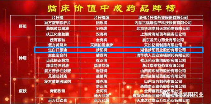 夢陽藥業拳頭產品生白口服液(合劑),憑借確切的臨床療效、充分的循證醫學證據、獨特的臨床主治功能、強大的品牌影響力,從參評的眾多中藥品種中脫穎而出,成功入選腫瘤領域臨床價值中成藥品牌榜單!這也是繼2019年,生白口服液(合劑)第三次榮登該榜單。